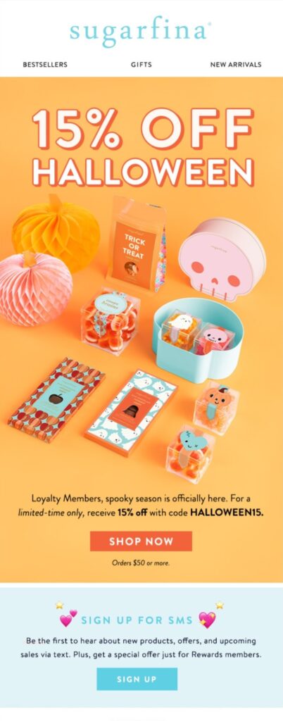 Sugarfina’s campaign subject line: ‘Loyalty Exclusive! 15% Off Halloween 🔮’ does this perfectly. Highlighting that the offer is only for loyal customers instantly creates a sense of exclusivity and makes it worth clicking.